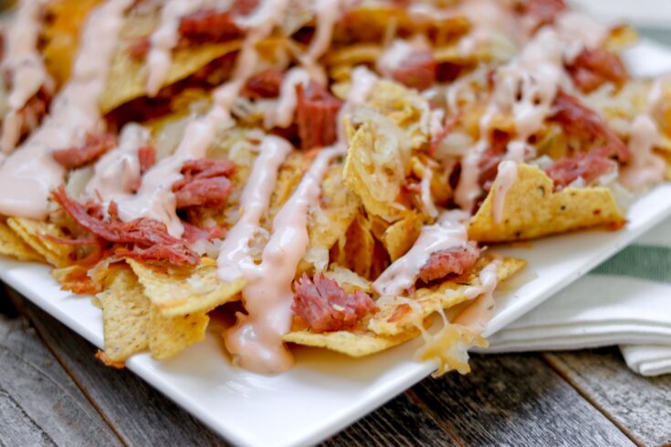 Tortilla chips get loaded up with melted Swiss and cheddar, then topped with shredded corned beef, tangy sauerkraut, and a creamy pickle-relish-mayo sauce for the ultimate comfort-food mash-up.