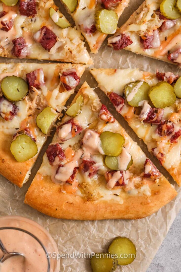 This fun twist layers corned beef, Swiss, mozzarella, and sauerkraut over pizza dough for all the classic Reuben flavors in a cheesy, shareable form.